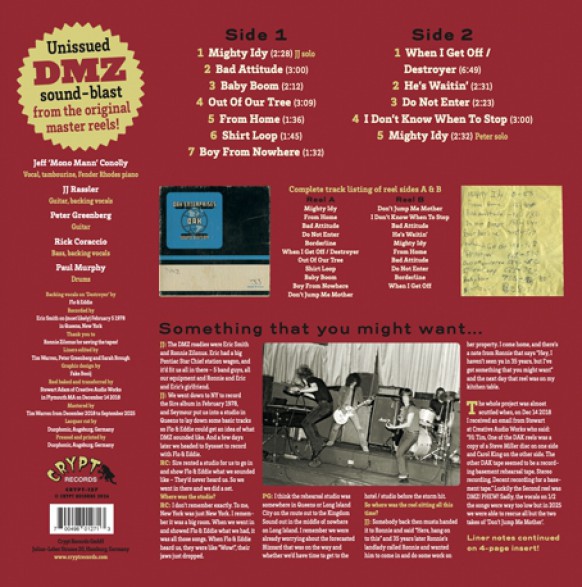 13 ripping songs totalling 33 minutes from the original 20-song 65 minute master reel tapes, recorded in early February 1978 for producers Flo & Eddie, the night before DMZ (the raw-assed pre-Lyres outfit that never made it!) spent 3 days trapped by a blizzard recording their Sire album.