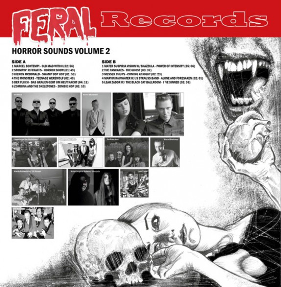 New 10" compilation from the Feral Horror Comic Magazine featuring Marcel Bontempi , Stompin’ Riffraffs, Kieron McDonald, The Monsters, Der Fluch, Zombina and the Skeletones, Mater Suspiria Vision W/ Shazzula, The Pancakes, Messer Chups, Marvin Rainwater W/ JS Strauss Band, Leah Zador W/ The Black Cat Ballroom. Limited pressing.