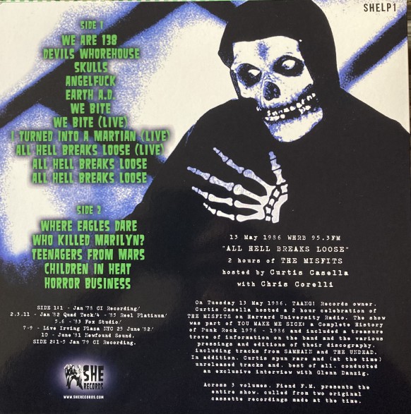 Info text from the back sleeve: On Tuesday 13 May 1986 TAANG! Records owner Curtis Casella hosted a 2 hour celebration of THE MISFITS on Harvard University Radio. The show was part of YOU MAKE ME SICK: a Complete History Of Punk Rock 1976 - 1986 and included a treasure trove of information on the band and the various pressings and editions of their discography, including tracks from SAMHAIN and THE UNDEAD. In additions, Curtis spun rare and (at the time) unreleased tracks and, best of all, conducted an exclusvie interview with Glenn Danzig.